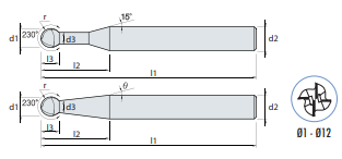 | # | Cod produs | d1 | r | d2 | d3 | l1 | l2 | l3 | z | 1 | 432010200 | 1,0 | 0,5 | 6 | 0,91 | 60 | 6 | 0,7 | 4 | 2 | 432015200 | 1,5 | 0,8 | 6 | 1,36 | 60 | 8 | 1,0 | 4 | 3 | 432020200 | 2,0 | 1,0 | 6 | 1,80 | 60 | 10 | 1,4 | 4 | 4 | 432030200 | 3,0 | 1,5 | 6 | 2,70 | 70 | 15 | 2,1 | 4 | 5 | 432040200 | 4,0 | 2,0 | 6 | 3,60 | 70 | 20 | 2,8 | 4 | 6 | 432060200 | 6,0 | 3,0 | 6 | 5,40 | 90 | 15 | 4,2 | 4 | 7 | 432080200 | 8,0 | 4,0 | 8 | 7,20 | 100 | 28 | 5,7 | 1 | 4 | 8 | 432100200 | 10,0 | 5,0 | 10 | 9,00 | 110 | 35 | 7,1 | 1 | 4 | 9 | 432120200 | 12,0 | 6,0 | 12 | 10,80 | 120 | 42 | 8,5 | 1 | 4 |